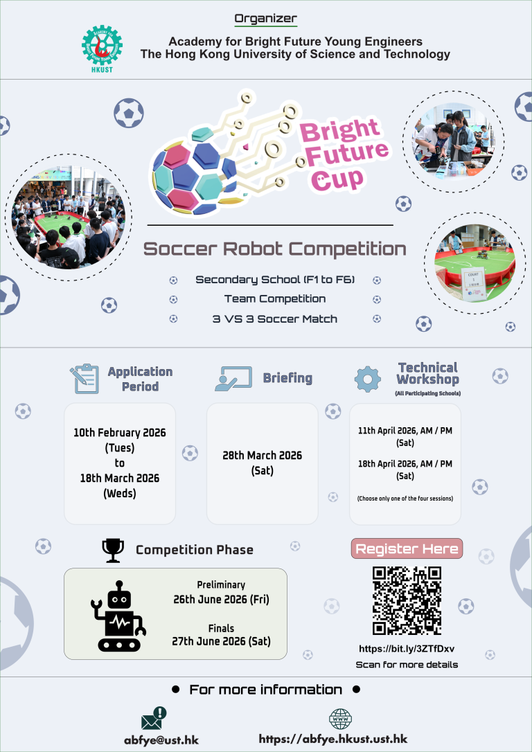 We would like to invite your school to participate in "Bright Future Cup 2026 - Robo-soccer Competition", which is organized by the Academy for Bright Future Young Engineers, HKUST. The competition offers a great opportunity for Secondary 1 to 6 students to experience design thinking and quick prototyping by building their own team of soccer robots and competing with other participating teams. Read more